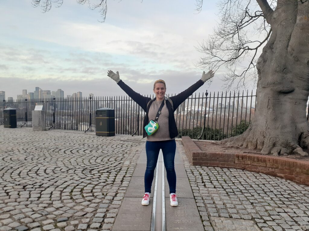 Standing over the Prime Meridian, where East meets West, in my new sneaks.