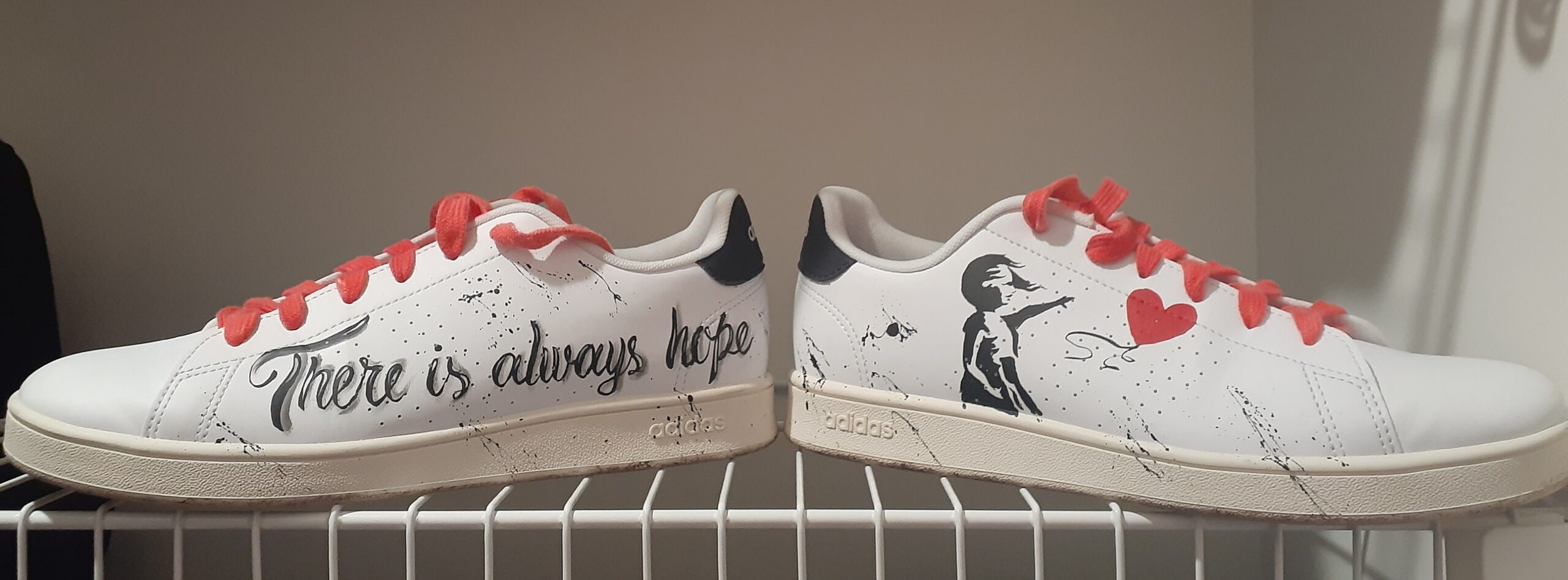 I enjoy many of Banksy’s creations, but this one has always been my favorite. I think I was originally drawn to it because it reminded me of the beautiful French film The Red Balloon, one of my favorite stories as a child. For many years, I had this mural as the skin on my laptop. When that computer eventually died, Stephen peeled off the skin and hung it up in his workout room. Last year, I bought a large canvas print of it. And when I returned to London this Thanksgiving to visit Stephen’s sister Emma, I found myself gazing at an incredible pair of sneakers that I just knew I had to have.